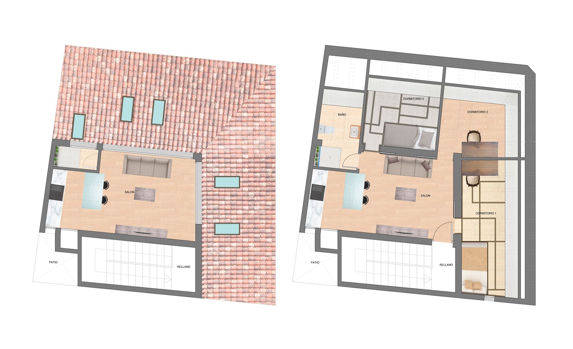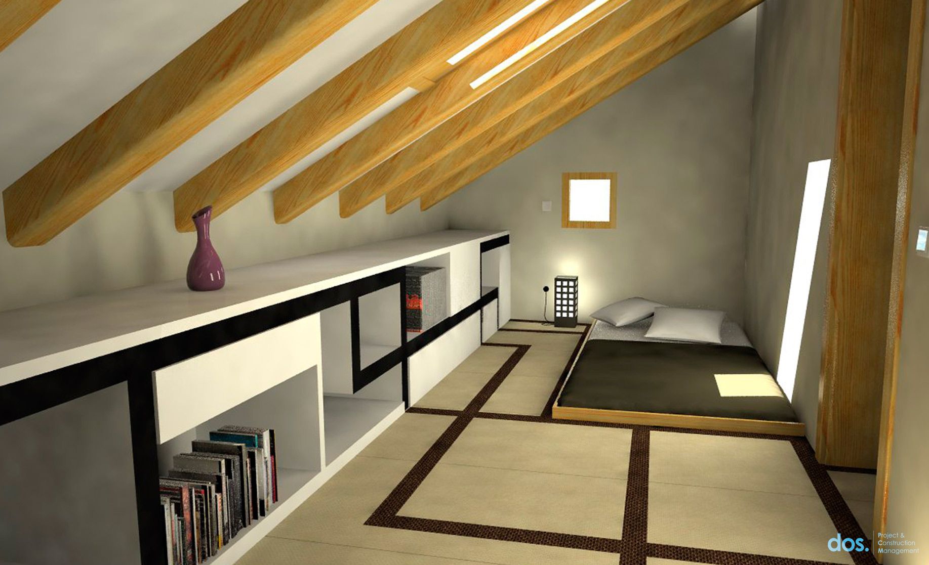 Este ático en pleno centro de Madrid era un diamante en bruto, con estructura vista de madera, con los dormitorios situados en la parte abuhardillada, era ideal para enfocar el proyecto hacia una decoración de estilo japonés.